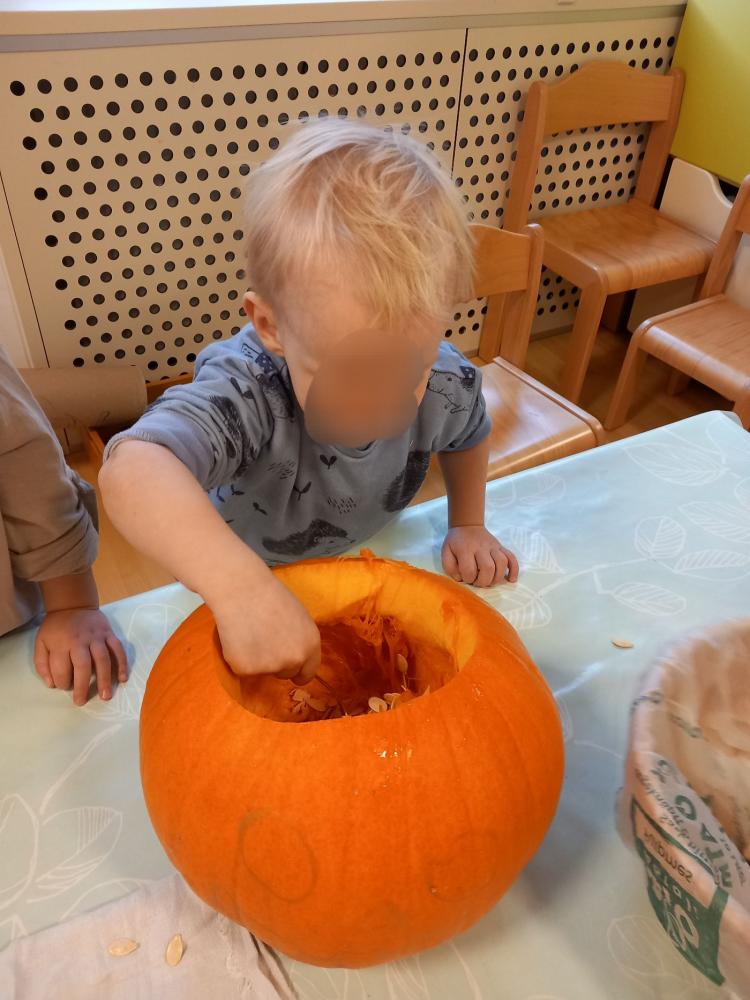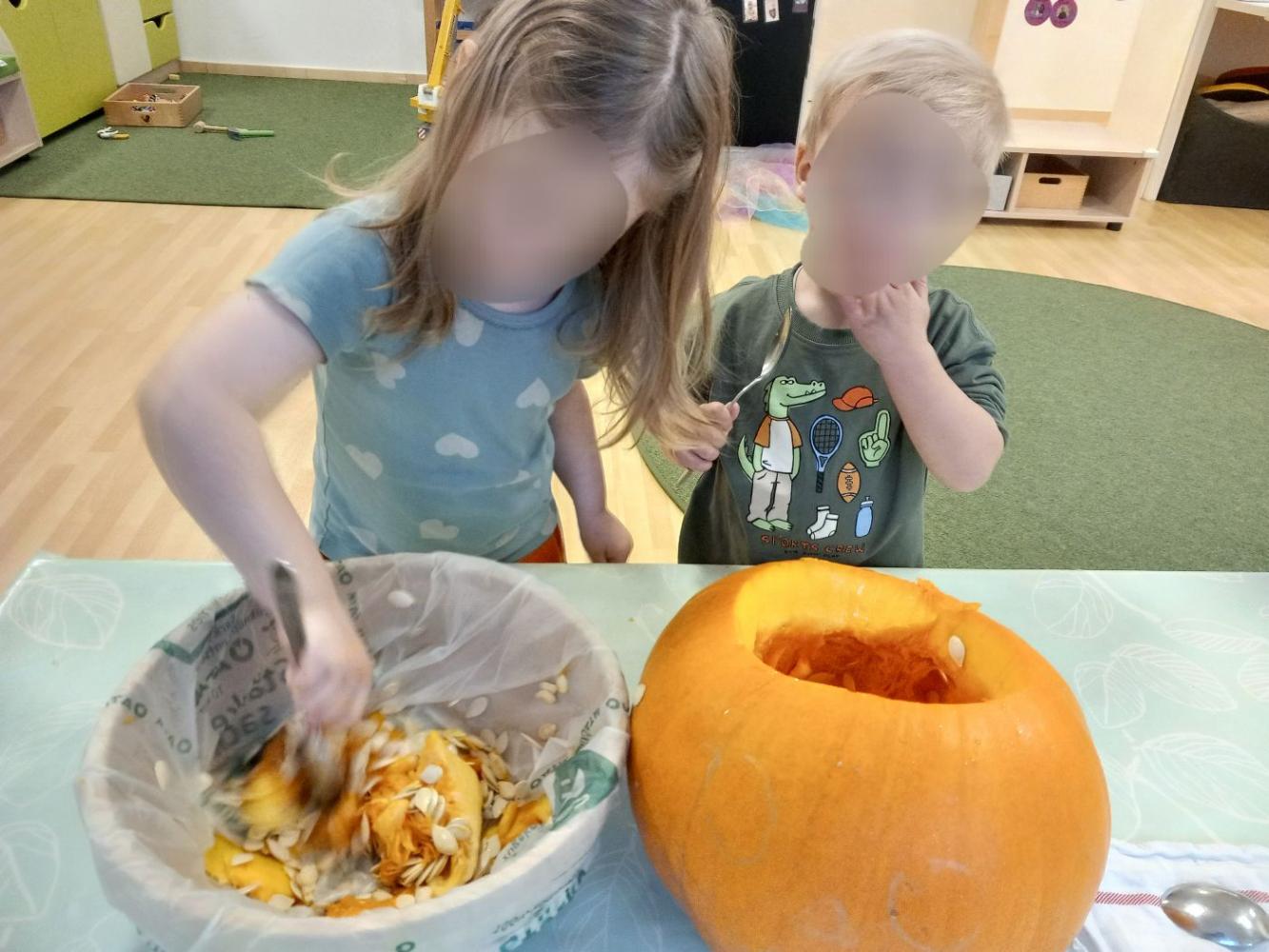 Zuerst wurden die Kürbisse ausgehöhlt, was für viel Gelächter sorgte und bei manchen auch viel Überwindung gekostet hat. Danach hieß es: Gesicht aufmalen, schnitzen und verzieren!